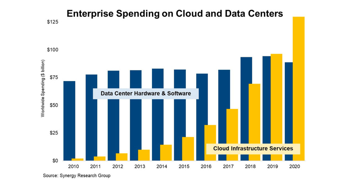 La consultora Synergy Research Group, ha publicado un informe con los datos de la evolución de la inversión empresarial en Infraestructura Cloud versus Infraestructura de centros de procesamiento de datos empresariales entre los años 2010 y 2020, y por primera vez la inversión en Cloud ha superado a la de los CPD.