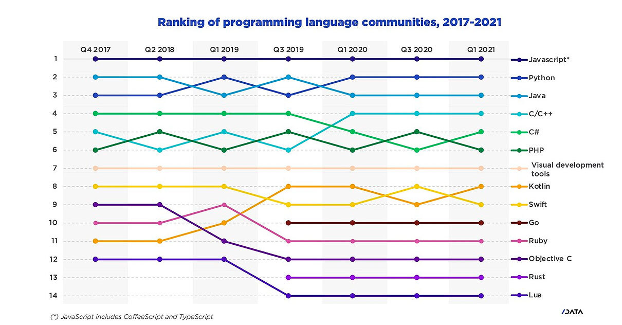 El cálculo se basa en un estimado de 24.3 millones de desarrolladores a nivel mundial, de los cuales 13.4 millones usan Javascript que lo posicionan en primer lugar, en segundo lugar con 10.1 millones de usuarios se encuentra Python, en tercer lugar se encuentra Java con 9.4 millones de usuarios, luego C/C++ con 7.3 millones de usuarios, C# con 6.5 millones de usuarios y en sexto lugar PHP con 6.3 millones de usuarios. Cabe señalar que se ha considerado que un usuario puede utilizar o conocer varios lenguajes.